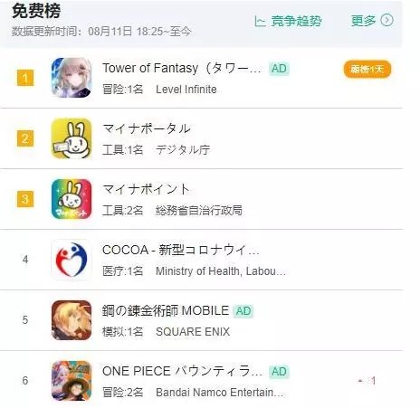 最近在国内挑战《原神》受挫的《幻塔》也开启了国际服,没想到游戏刚一出海就打出了不错的成绩,在多个国家登上了免费榜前十。并且由于其二次元属性,在日本更是拿下了免费榜首位。