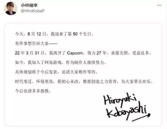 8月12日,知名游戏制作人小林裕幸发布声明,自己已于2022年3月31日从工作了27年的卡普空离职,将加入网易游戏继续担任游戏制作人,具体规划会在未来发布。