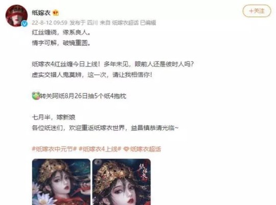 《纸嫁衣4红丝缠》原定于今年7月29日发售,但是为了本身调性,硬是跳票了中元节的这天正式上线。事实证明,这个举动也为游戏带来了不少热度,游戏上线时还登上了微博热搜第一。