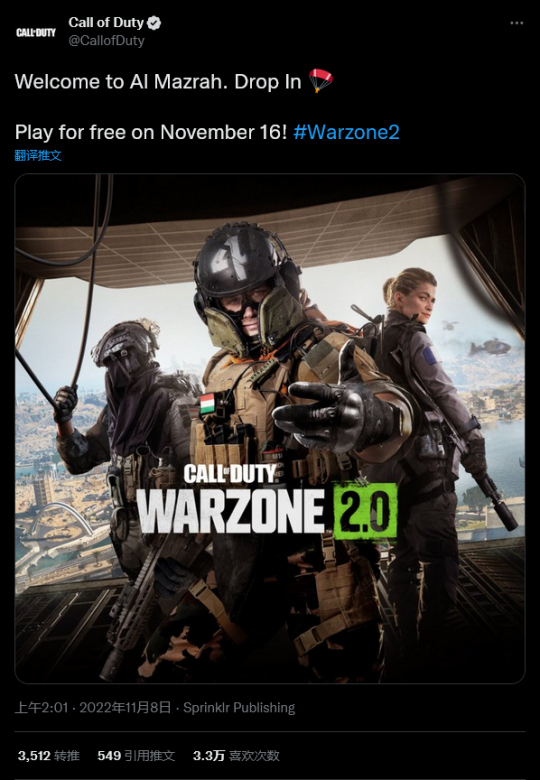今天《使命召唤》官方推特发文分享了一张计划在11月16日上线的《使命召唤:战区2.0》全新海报。