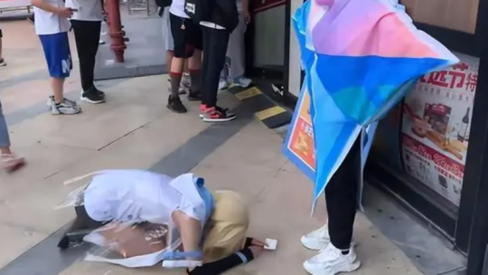 其次,该活动又被曝出了有魔怔人在必胜客门口,大搞Cosplay下跪等一系列让人倍感抽象的离谱行为。