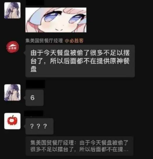 最让人头皮发麻的是,在原神x必胜客联动的同时,网络上曝出了必胜客工作人员吐槽原神玩家偷盘子的聊天截图。