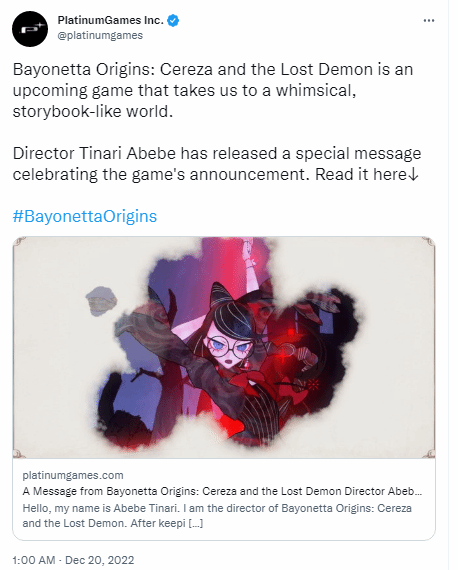 不久前举行的TGA 2022颁奖典礼上,白金工作室正式公布了《猎天使魔女》系列新作《猎天使魔女:起源》,该作计划将于2023年3月17日发售,独家登陆NS,已开启预购,支持中文。 近日白金工作室的官方网站也刊登了系列制作人神谷英树对于游戏的介绍。